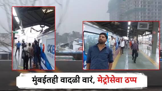 एअरपोर्ट रोड स्टेशनवरवर ही मेट्रो थांबली आहे, वादळी वाऱ्यामुळे बॅनर पडल्याने घाटकोपर-वर्सोवो मेट्रो ठप्प झाली. मेट्रो प्रशासनाकडून हा बॅनर काढण्याचा प्रयत्न सुरू आहे. घाटकोपर येथून वर्सोवा मार्गावर धावणारी ही मेट्रो जागेवर थांबली आहे. त्यामुळे, प्रवाशी खोळंबले असून एअरपोर्ट मेट्रो स्टेशनवरच अडकून पडले आहेत.