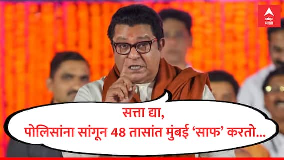मुंबई : मुंबई पोलिसांवर माझा 100 टक्के विश्वास आहे, माझी सत्ता आल्यानंतर मी पोलिसांना मुंबई साफ करण्यासाठी 48 तास देईन, सगळ्यांना सडकून काढेन असं राज ठाकरे म्हणाले. इथले कोळी बांधव हे मुंबईचे राजे आहेत, तुम्ही रडायचं नाही तर बाहेरून येणाऱ्यांना रडवायचं असंही राज ठाकरे म्हणाले. माझ्या हाती सत्ता द्या, पहिल्या 48 तासांमध्ये राज्यातील मशिदींवरचे भोंगे उतरवणार असंही ते म्हणाले. राज ठाकरेंनी वरळीत मनसेचे उमेदवार संदीप देशपांडे यांच्या प्रचार सभा घेतली. त्यावेळी ते बोलत होते.