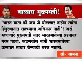 मुंबई: भारत माता की जय प्रश्नावर मुख्यमंत्र्यांनी काल विधानसभेत दाखवलेल्या आक्रमक अवतारावर आज शिवसेनेचं मुखपत्र असलेल्या सामनाधून उपरोधिक टोले लगावण्यात आले आहेत. 'भारत माता की जय म्हणावचं लागेल असा आक्रमक पवित्रा घेतला. पण, अवघ्या काही दिवसातचं मुख्यमंत्री आपल्या भूमिकेवरुन नरम पडले. अखंड महाराष्ट्रासाठी लढणाऱ्या शिवसैनिकांवर नाशकात दरोड्याचे गुन्हे टाकण्यात आले, मग राज्यात येऊन 'भारत माता की जय' म्हणणार नाही असं म्हणणाऱ्या ओवैसीवर कारवाई करुन त्याला तुरुंगात टाकण्याची मुख्यमंत्र्यांनी हिंमत का दाखवली नाही?' असा उपरोधिक सवाल आजच्या सामनामधून विचारण्यात आला आहे. दरम्यान, आता सेनेच्या या टीकेला मुख्यमंत्री देवेंद्र फडणवीस नेमकं काय उत्तर देणार हे पाहणं महत्त्वाचं ठरणार आहे. एक नजर सामनाच्या अग्रलेखावर: महाराष्ट्राचे मुख्यमंत्री देवेंद्र फडणवीस यांनी आक्रमक पद्धतीने सांगितले की, ‘भारतमाता की जय बोलावेच लागेल. जे भारतमाता की जय बोलणार नाहीत त्यांना हिंदुस्थानात राहाण्याचा अधिकार नाही!’ फडणवीस यांनी हे आधी जोरात सांगितले व नंतर भारतमातेच्या प्रश्नी ते नरम पडले. फडणवीस यांनी भारतमातेच्या प्रश्नी माघार घेण्याची गरज नव्हती, पण त्यांनी माघार घेतली व त्याचे खापर नेहमीप्रमाणे मीडियावर फोडले. हे असे का झाले याचा खुलासा मुख्यमंत्र्यांनीच करायला हवा. ‘भारतमाता की जय’ ही घोषणा म्हणजे देशाचा आत्मा आहे व काही लोक हा आत्मा नष्ट करण्याचा प्रयत्न करीत आहेत. हिंदुस्थानात व महाराष्ट्रात सध्या राष्ट्रवादी विचारांचे सरकार असल्याची भावना (की अफवा आहे?) आहे. त्यामुळे याबाबत कोणतीही तडजोड व फालतू राजकारण होऊ नये. दारुल उलूम देवबंदवाल्यांनी ‘मुसलमानांनी भारतमाता की जय बोलू नये,’ असा फतवा काढून राष्ट्रद्रोही बांग दिली. त्यामुळे मुख्यमंत्र्यांची भूमिका योग्यच ठरते, पण ते आधी कठोर झाले व नंतर जास्त पिकलेल्या केळ्याप्रमाणे नरम झाले. सरसंघचालक मोहनराव भागवत यांनीही आधी सगळ्यांना भारतमाता की जय बोलावेच लागेल, भारतमाता की जयचा नारा जगभरात घुमवू असे बजावले; पण लगेच सरसंघचालकही नरम पडले! अशी सक्ती करून कसे चालेल? अशी भूमिका त्यांनी घेतली. या बदललेल्या भूमिका आश्चर्यकारक, तितक्याच धक्कादायक आहेत. सक्ती करू नये हे ठीक, पण जे भारतमातेला मानायलाच तयार नाहीत त्यांचे काय करायचे? निदान त्यांच्यावर कारवाई तरी करा. तरच ‘भारतमाता की जय’च्या घोषणांना खरा अर्थ राहील. मुख्यमंत्री सोमवारी विधानसभेत या मुद्द्यावरून पुन्हा आक्रमक वगैरे झाले. ‘भारतमाता की जय’ म्हणणारच असे ‘च’वर जोर देऊन तर त्यांनी सांगितलेच, शिवाय ‘खुर्ची गेली तरी चालेल, पण या मुद्द्यावर माफी मागणार 