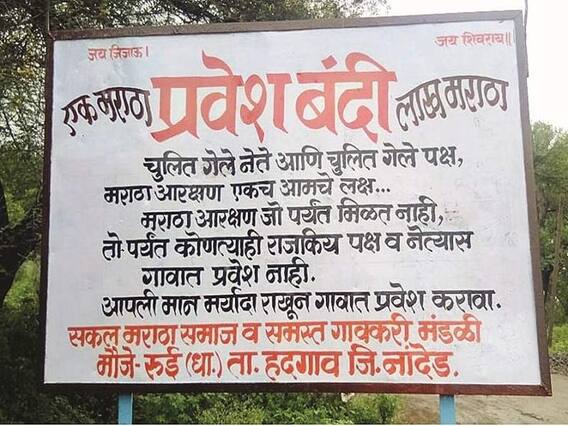 जोपर्यंत मराठा आरक्षण मिळत नाही तोपर्यंत राजकीय नेत्यांना गावात प्रवेश नाही, अशा आशयाचे फलक काही गावात लावण्यात आले आहेत. नांदेड जिल्हयातील अर्धापूर तालुक्यातील मेंढला आणि उमरी या गावात नेत्याच्या गावबंदीचे फलक लावण्यात आले. चुलीत गेले नेते, चुलीत गेले पक्ष, मराठा आरक्षण हेच आमचं लक्ष...असे यावर उल्लेख करण्यात आला आहे. मराठा आरक्षण मिळेपर्यंत सर्वच राजकीय पक्ष आणि नेत्यांना गावात प्रवेश नाही. असा मजकूर या फलकावर आहे. मेंढला येथील गावकऱ्यांनी नेत्याच्या गावबंदीसह मतदानावर बहिष्कार घालण्याचा देखील निर्णय घेतला आहे. उमरी गावात देखील असे फलक लावण्यात आले. दोन्ही गावातील काही तरुण जरांगे पाटील यांना पाठिंबा देण्यासाठी उपोषणावर देखील बसले आहेत. त्यामुळे मराठा आरक्षणाच्या आंदोलनाची धग आता गावागावात पाहायला मिळत आहे.