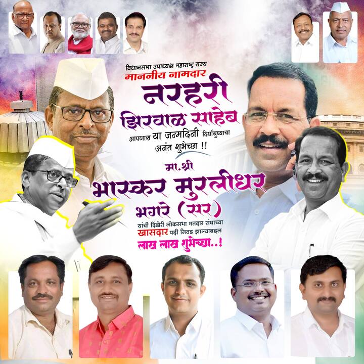 नरहरी झिरवाळ यांना वाढदिवसाच्या शुभेच्छा देणाऱ्या बॅनर्सवर शरद पवार आणि भास्कर भगरे यांचे फोटो असणाऱ्या पोस्ट व्हायरल झाल्यानं खळबळ उडाली आहे. वर्तमान पत्रातील जाहिराती आणि सोशल मीडियातील पोस्टवर शरद पवार , भास्कर भगरे आणि श्रीराम शेटे यांच्या फोटोमुळे झिरवाळ चर्चेत आले आहेत.