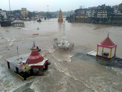 नाशिक : नाशिकमध्ये गेल्या तीन दिवसांपासून पावसाची जोरदार बॅटिंग सुरु आहे. गोदावरी नदीच्या पाणीपात्रात देखील वाढ झली आहे. पुराचा पहिला इशारा देणाऱ्या दुतोंड्या मारुतीच्या गुडघ्यापर्यंत पाणी आले असून, लक्ष्मणपूल, रामसेतूसह अनेक छोटे पूल आणि मंदिरं पाण्याखाली गेली आहेत. पावसाचा जोर असाच कायम राहणार असल्याचा अंदाज वर्तवण्यात आला असून प्रशासनाकडून नदीकाठच्या गावांना सतर्कतेचा इशारा देण्यात आला आहे. नाशिकमध्ये आज सकाळी 36 मिमी पावसाची नोंद झाली, तर जिल्ह्यात इगतपुरी-216, पेठ-119, त्र्यंबक-88 आणि सुरगाणामध्ये 73 मिमी पाऊस नोंदवला गेला आहे. दुसरीकडे, नाशिकमधील गंगापूर धरण 74 टक्के भरले आहे. गंगापूर आणि दारणा धरणातून पाण्याचा विसर्ग सुरु करण्यात आला आहे. यंदाच्या पावसाळ्यात पहिल्यांदाच विसर्ग सुरु करण्यात आला. गेल्या दोन दिवसांपासून धरण पाणलोट क्षेत्रात पावसाचा जोर वाढला आहे.