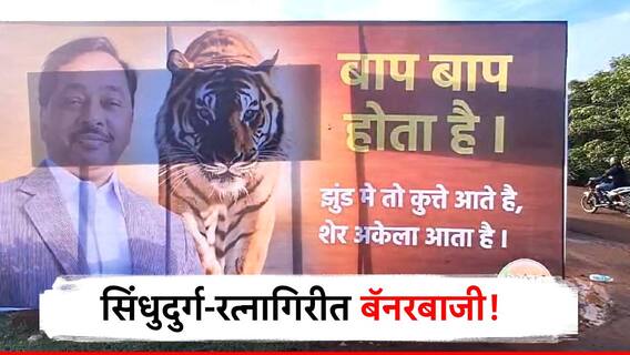 सिंधुदुर्गनंतर आता रत्नागिरीतही बॅनर वॉर चालू झाले आहे. हे युद्ध आता थेट उदय सामंत यांच्या पाली गावापर्यंत पोहोचले आहे. या गावात भाजपचे एक बॅनर लागले आहे. 'बाप बाप होता है. झुंड मे तो कुत्ते आते है, शेर अकेला आता है,' अशा आशयाचे बॅनर या भागात लावण्यात आले आहे. कणकवलीतल्या शिंदे गटाच्या बॅनरला उत्तर म्हणून हे बॅनर लावण्यात आल्याचे म्हटले जात आहे. कोकणात सध्या महायुतीमध्ये अंतर्गत संघर्ष चालू आहे. याच संघर्षातून हे बॅनरबाजीचे वॉर चालू झाले आहे. पाली गावात लावण्यात आलेल्या या बॅनरवर नारायण राणे यांचा फोटो आहे. तसेच मागे वाघाचेही चित्र आहे.