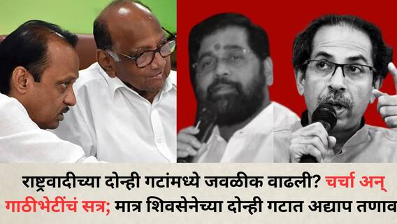 राज्यात दोन मोठे पक्ष फुटले. एक शिवसेना आणि दुसरा राष्ट्रवादी काँग्रेस. राष्ट्रवादी काँग्रेसमध्ये फूट पडून दोन गट झाले, पण अलीकडे होणाऱ्या बैठका, चर्चा, कार्यक्रमांना एका मंचावर येण या काही घटना बघता दोन्ही पक्षांमध्ये दुरावा कमी होत असल्याचे चित्र आहे. आता किंवा भविष्यात दोन्ही पक्ष एकत्र येतील की नाही याबाबत ठोस असं काही सांगता येत नसलं तरी त्यांच्यातील जवळीक वाढत असल्याचं जाणवत आहे.
