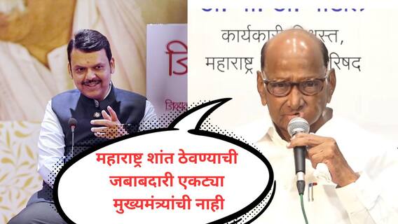 Sharad Pawar on Devendra Fadnavis, पुणे : "परभणी आणि इतर भाग शांत झाला पाहिजे. मी इथे येण्याच्या आधी देवेंद्र फडणवीस यांच्याशी फोनवरून चर्चा केली. ही परिस्थिती शांत झाली राजकिय विचार वेगळे असतील पण महाराष्ट्र शांत ठेवण्याची जबाबदारी सर्वांचीच. एकट्या मुख्यमंत्र्यांची ती नाही" असं देशाचे माजी केंद्रीय कृषी मंत्री शरद पवार म्हणाले आहेत. दिल्ली साहित्य संमेलनातील भाषणांचा पुस्तक प्रकाशन सोहळा पुण्यात पार पडला. यावेळी ते बोलत होते.