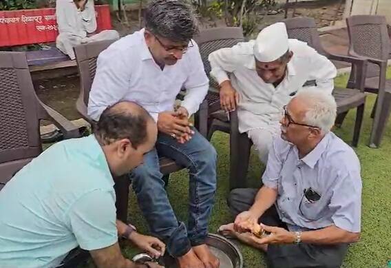 पुणे जिल्ह्यातील (Pune District) वाबळेवाडीच्या शाळेचा कायापालट करणाऱ्या दत्तात्रय वारे गुरुजींची नुकतीच त्यांच्यावरील आरोपांमधून निर्दोष मुक्तता करण्यात आली. गावच्या राजकारणातून वारे गुरुजींवर वाबळेवाडीच्या शाळेत गैरव्यवहार केल्याचा ठपका ठेवण्यात आला होता. त्यानंतर त्यांचं निलंबन करण्यात आलं होतं. यामुळे वारे गुरुजींनी पायात चप्पल घालणं बंद केलं होतं. जोपर्यंत मी निर्दोष असल्याचं सिद्ध होत नाही तोपर्यंत चप्पल घालणार नाही, असा निर्धार वारे गुरुजींनी केला होता. आता जिल्हा परिषदेच्या चौकशी समितीने वारे गुरुजींना निर्दोष ठरवल्यावर वारे गुरुजींनी चप्पल घालावी यासाठी मनसेचे नेते प्रकाश महाजन यांनी वारे गुरुजींचे वाबळेवाडीतील शाळेत जाऊन पाय धुतले आणि पुन्हा चप्पल घालण्याची विनंती केली.