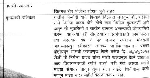 पुणे : ‘सोवळे मोडले’ म्हणून स्वयंपाकी महिलेवर गुन्हा दाखल केल्याचा धक्कादायक प्रकार पुरोगामी पुण्यात घडला आहे. हवामान विभागाच्या माजी संचालिका डॉ. मेधा खोले यांनी या प्रकरणी फिर्याद दाखल केली आहे. घरकामासाठी आलेल्या बाईवर जात लपवून ‘सोवळे मोडले’ म्हणून मेधा खोले यांनी पोलिसात तक्रार केली आहे. दरम्यान, याप्रकरणाची नेमकी तक्रार कशी नोंदवून घ्यायची याबाबत पोलिसांना देखील प्रश्न पडला होता. त्यांनी मेधा खोले यांची समजूत घालण्याचाही प्रयत्न केला. पण तरीही मेधा खोले या तक्रार नोंदवून घेण्यासाठी अडून बसल्या. अखेर पोलिसांनी संबंधित महिलेविरोधात फसवणुकीचा गुन्हा नोंदवला. नेमकं प्रकरण काय? मेधा खोले यांना गौरी-गणपतीदरम्यान सोवळ्यातील स्वयंपाक करणारी सुवासिनी ब्राम्हण महिला हवी होती. 2016 मध्ये निर्मला कुलकर्णी नावाची एक स्त्री त्यांच्याकडे आली. आपल्याला कामाची गरज असल्याचं सांगत त्यांनी खोले यांच्याकडे स्वयंपाकाचं काम मागितलं. त्यावेळी खोले यांनी निर्मला यांच्या घरी जाऊन ही महिला ब्राम्हण आहे की, नाही याची चौकशी केली. त्यानंतर त्यांनी तिला स्वयंपाकाचं काम दिलं. नुकताच पार पडलेल्या गौरी-गणपतीतही निर्मला यांनीच मेधा खोले यांच्या घरी सोवळ्यातील नैवेद्याचा स्वयंपाक केला होता. पण काल (बुधवार) निर्मला ही ब्राम्हण नसल्याची माहिती खोले यांना समजली. त्यामुळे पुन्हा शाहनिशा करण्यासाठी खोले या निर्मला यांच्या घरी गेल्या. त्यावेळी आपलं नाव निर्मला यादव असल्याचं त्यांनी सांगितलं. त्यानंतर दोघींमध्ये बराच वाद झाला. यावेळी आपल्याला महिलेनं दमदाटी आणि शिवीगाळ केल्याची तक्रार मेधा खोले यांनी सिंहगड पोलिसात केली आहे.
