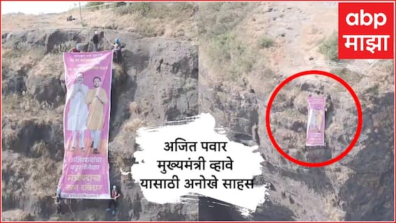 Maharashtra New CM : मुख्यमंत्री पदासाठी चढाओढ सुरू असतानाच मावळातील तरुणांनी एक अनोखं साहस केलं आहे. अजित पवार (Ajit Pawar) महाराष्ट्राचे मुख्यमंत्री (Maharashtra New CM) व्हावे, यासाठी तरुणांनी 800 फूट उंच कड्यावरुन बॅनर झळकावला आहे. सोबतच मावळचे (Maval) आमदार सुनिल शेळके (Sunil Shelke) यांना मंत्रिमंडळात स्थान मिळावं, अशा आशयाचा 30 फुटाचा मोठा बॅनर नागफणी कड्यावर झळकावण्यात आला आहे.