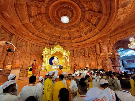 पुणे : पुणेकरांचा लाडका दगडूशेठ गणपती दिमाखात विराजमान झाला आहे. डॉ.मोहन भागवत यांच्या हस्ते दगडूशेठ गणपतीची प्रतिष्ठापना करण्यात आली. जय गणेश... गणपती बाप्पा मोरया... मंगलमूर्ती मोरया... च्या जय घोषासोबतच जय श्रीराम, जय श्रीरामच्या नादघोषात श्री हनुमान (Pune ganeshotsav 2023) रथातून वाजत गाजत मिरवणूक काढण्यात आली. अयोध्येतील श्रीराम मंदिर प्रतिकृतीत (Ram temple ayodhya) दगडूशेठचे गणपती बाप्पा (Shrimant gadadusheth temple) विराजमान झाले. श्रीमंत दगडूशेठ हलवाई सार्वजनिक गणपती ट्रस्ट, सुवर्णयुग तरुण मंडळ च्यावतीने ट्रस्टच्या 131 व्या वर्षानिमित्त आयोजित उत्सवाचा प्रारंभ हजारो भक्तांच्या साक्षीने झाला. अयोध्येतील श्रीराम मंदिर प्रतिकृतीमध्ये गणेश चतुर्थीला सकाळी 10 वाजून 23 मिनिटांनी राष्ट्रीय स्वयंसेवक संघाचे सरसंघचालक डॉ.मोहन भागवत (mohan bhagwat) यांच्या हस्ते श्रींची प्राणप्रतिष्ठापना झाली. यावेळी ट्रस्टचे अध्यक्ष माणिक चव्हाण, उपाध्यक्ष डॉ.रामचंद्र उर्फ बाळासाहेब परांजपे, सुनिल रासने, कोषाध्यक्ष महेश सूर्यवंशी, सरचिटणीस हेमंत रासने, उत्सव प्रमुख अक्षय गोडसे, सहचिटणीस अमोल केदारी, सुवर्णयुग तरुण मंडळाचे अध्यक्ष प्रकाश चव्हाण यांसह कार्यकर्ते मोठया संख्येने उपस्थित होते. मुख्य मंदिरापासून सकाळी 8.30 वाजता श्रीं च्या आगमन मिरवणुकीला प्रारंभ झाला. श्रींची विलोभनीय मूर्ती डोळ्यात साठविण्यासोबतच दर्शनासाठी भक्तांनी चौका-चौकात गर्दी केली.