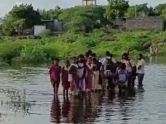 Sangola News : राज्यातील शिंदे गटाचे स्टार आमदार म्हणून सांगोल्याचे (Sangola) शहाजीबापू पाटील (Shahajibapu Patil) प्रसिद्ध आहेत. त्यांच्या गुवाहाटीमधील काय झाडी, काय डोंगार, काय हाटील या डायलॉगची राज्यभर चर्चा झाली होती. त्यानंतर शहाजीबापू पाटील राज्यभर चर्चेत आले होते. दरम्यान, आता शहाजीबापूंच्या सांगोला मतदारसंघातील विविध प्रश्न समोर येत आहेत. तालुक्यातील दक्षिण भागात असलेल्या जुजारपूर येथील ओढ्याला दर पावसाळ्यात भरपूर पाणी येते. यावर्षी देखील ओढ्याला पूर आला आहे. अशा पाण्यातूनच ग्रामस्थांसह विद्यार्थ्यांना वाट काढावी लागत आहे.