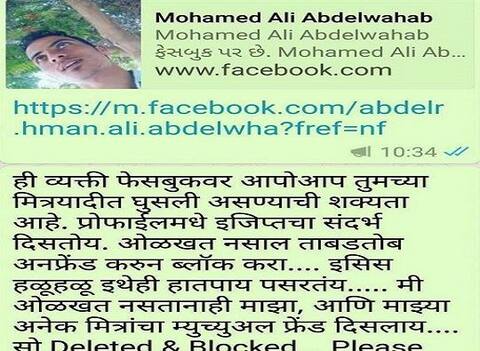 Mohamed Ali Abdelwahab नावाची फेसबुक प्रोफाईल तुमच्या फेसबुक फ्रेण्ड लिस्टमध्ये असल्यास ताबडतोब डिलीट करा