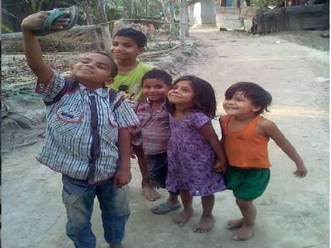 हातात स्लीपर घेऊन सेल्फीची पोझ देणाऱ्या चिमुरड्यांचा हा फोटो आहे. एकाने हातात स्लीपर कॅमेरासारखी धरल्यानंतर बाकीचे चौघं जण कौतुकभरल्या नजरेने त्याकडे पाहत आहेत आणि जणू सेल्फीची पोझ दिल्यासारखा चेहरा करत आहेत.