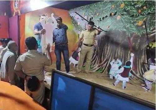 विजय तरुण मंडळाकडून पोलिसांच्या कारवाईचा निषेधया कारवाईचा विजय तरुण मंडळाचे विश्वस्त विजय साळवी यांनी निषेध केला. ते म्हणाले की, "मंडळतर्फे प्रत्येक वर्षी संबंधित वर्षातील महत्त्वाच्या घडामोडींवर देखावा साकारला जातो. यंदा शिवसेनेतील फूट पडली, यावर देखावा साकारण्यात आला होता. देखाव्यात काहीच आक्षेपार्ह नव्हतं. पहाटेच्या सुमारास कारवाई केली. ही हिटलरशाही आहे. आम्ही या कारवाईविरोधात न्यायालयात दाद मागणार असून या कारवाईचा निषेध म्हणून आम्ही यंदा गणेश मूर्तीची स्थापना करणार नाही."