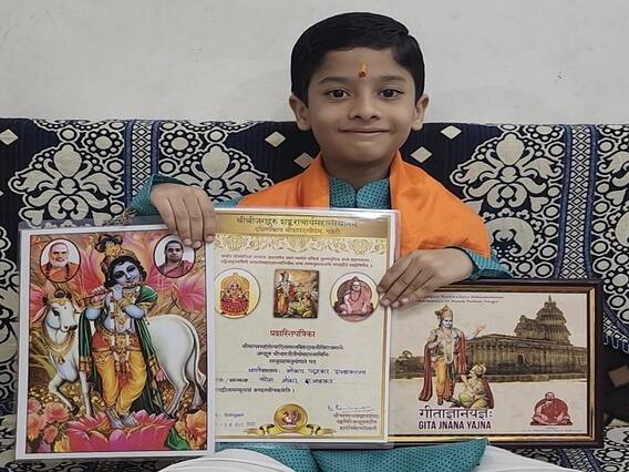 Dombivli News : वय अवघे सात वर्ष, या वयात मातृभाषेतील मराठी उच्चार देखील बोबडे असतात. मात्र डोंबिवलीच्या (Dombivli) सात वर्षाच्या व्योमने कमालच केली आहे. सात वर्षीय व्योम दाभाडकर याने भगवद्गीतेचे (Bhagavad Gita) सगळे 18 अध्याय, त्यामधील 700 श्लोक शास्त्रशुद्ध उच्चारणासह पूर्ण पाठ केले आहेत. कोणत्याही अध्यायातील कोणत्याही श्लोकाची सुरुवात सांगितली की तो पुढील संपूर्ण श्लोक सांगू शकतो. अगदी मधूनमधून कोणताही श्लोक विचारला तरी व्योम न चुकता सांगतो. व्योमने नुकतेच कर्नाटक शृंगेरी येथे शारदा पिठातील शंकरचार्यांसमोर भगवद्गीता पाठांतर परीक्षेत प्रथम क्रमांकाचं पारितोषिक मिळवलं. शंकराचार्यांच्या हस्ते त्याचा 21 हजार रुपये आणि प्रमाणपत्र देऊन विशेष गौरव करण्यात आला आहे.