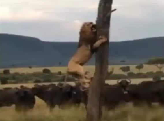 कधी कधी जंगलाच्या राजालाही जीवन-मरणाच्या खेळात पराभूत व्हावे लागते. अशावेळी कोल्हा देखील सिंह बनतो. व्हायरल होत असलेल्या व्हिडिओमध्ये तुम्ही बघू शकता की, म्हशींचा कळप झाडाखाली उभा आहे. मात्र, सिंह त्यांची शिकार करण्याऐवजी झाडावर चढत आहे. हा व्हिडीओ पाहून म्हशींचा कळप पाहून सिंह घाबरला असून जीव वाचवण्यासाठी झाडावर चढत असल्याचं दिसतंय.