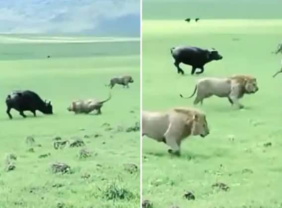 साधारणपणे जंगलचा राजा सिंह जंगलातील इतर प्राण्यांची शिकार करताना पाहायला मिळतो. त्यामुळे इतर प्राणी त्याच्यापासून दूर पळतात. पण सध्या व्हायरल झालेल्या व्हिडीओमध्ये सिंह जीव वाचवून पळताना दिसत आहे. या व्हायरल व्हिडीओमध्ये ज्यामध्ये सिंहांचा कळप जंगलात शिकार करताना दिसत आहे. यावेळी ते म्हशींच्या कळपावर हल्ला करण्याचा प्रयत्न करतात.