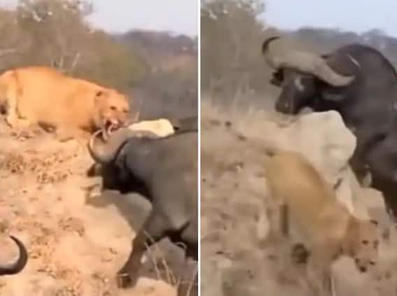 सध्या व्हायरल होत असलेल्या व्हिडीओमध्ये, एक सिंहीण म्हशींच्या कळपात अडकलेली दिसत आहे. सिंहीण आपला जीव वाचवण्यासाठी इकडे-तिकडे पळून स्वत:ला वाचवताना दिसत आहे. त्यानंतर म्हशी सिंहींणीला शिंगावर घेऊन हवेत फेकते. सध्या तिला फारशी दुखापत होत नाही, त्यानंतरही सिंहीण आपला जीव वाचवण्यासाठी मातीच्या ढिगाऱ्यावर धावताना दिसत आहे.