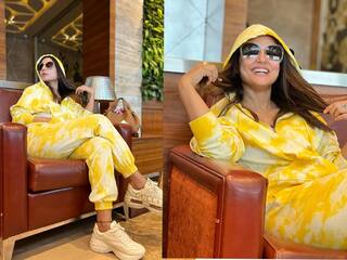 पिवळ्या रंगाचा ट्रॅक सूट आणि कॅज्युअल शुजमधला हिनाचा हा लूक एकदम कूल दिसतोय. (Photo:@realhinakhan/IG)