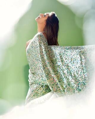 या फोटोमध्ये मलाईकाने मनीष मल्होत्राची मल्टी सेक्विन फॉरेस्ट ग्रीन साडी नेसली होती.