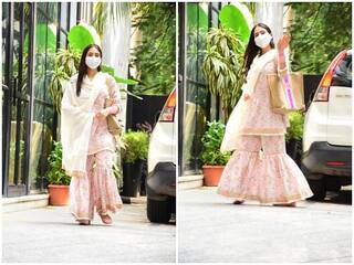 फिकट गुलाबी रंगाचा सूट परिधान केलेली सारा खान या फोटोंमध्ये खूपच सुंदर दिसत आहे. या देसी अवतारात सारा मॅडॉकच्या ऑफिसमध्ये पोहोचली.