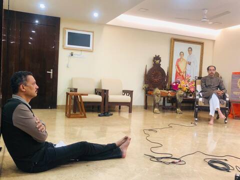 मुख्यमंत्री उद्धव ठाकरे यांची मुलाखत सुरु असताना त्यांचे स्वीय सहाय्यक आणि शिवसेनेचे सचिव मिलिंद नार्वेकर खाली बसून मुलाखत ऐकत होते.