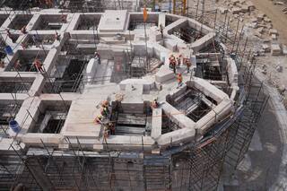 सध्या तळमजल्यावरील छप्पर बांधलं जात आहे. मंदिराच्या ठिकाणी बांधकाम करणारे कामगार दिसत आहेत. तळमजल्यावरील खांबांवर बीम टाकण्याचे काम सुरु आहे.