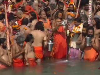 कुंभ मेळ्यातील तिसऱ्या शाही स्नानामध्ये निरंजनी आखाड्यातील साधू सहभागी झाले.