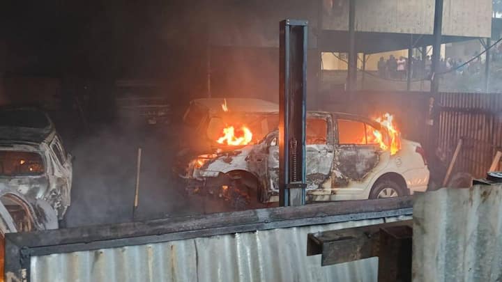कोल्हापूर जिल्ह्यातील आजरा शहरात भीषण आगीत 7 चारचाकी वाहनांसह अनेक दुकाने जळून खाक झाली.