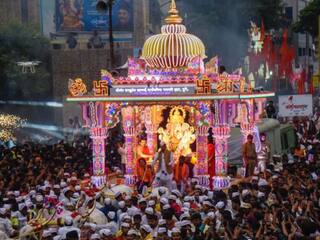 अनंत चतुर्दशीला 'दगडूशेठ' चे गणपती बाप्पा हजारो मोतिया रंगाच्या व एलईडी दिव्यांनी उजळलेल्या श्री स्वानंदेश रथामध्ये विराजमान होत सांगता मिरवणुकीत सहभागी झाले.