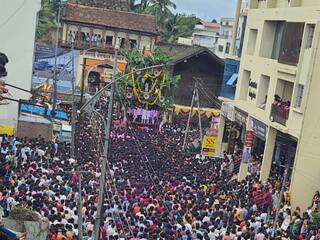 रथासमोरील मानवी मनोरे, झांजपथक, समोर दिमाखात चालणारी ‘गौरी’ हत्तीण यामुळे गणपती मंदिर समोरचा संपूर्ण परिसर मंगलमय वातावरणाने नाहून गेला होता.