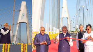 हा सेतू 2.5 किलोमीटर लांबीचा असून भारतातील सर्वात लांब केबल-स्टेड पूल आहे. (Photo credit : Twitter/ PM Narendra Modi )