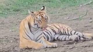 यवतमाळच्या टिपेश्वर अभयारण्यात पाण्याच्या डबक्यामध्ये वाघाने बैठक मारली आहे.