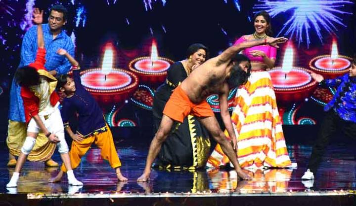 सुपर डान्स शो या कार्यक्रमात चक्क योगगुरु रामदेव बाबा हे गेस्ट म्हणून पोहोचले. यावेळी अभिनेत्री शिल्पा शेट्टीही उपस्थित होती. 'सुपर डान्स शो'च्या मंचावर रामदेव बाबांनी वेगवेगळी आसनं करुन दाखवली. पाहा फोटो