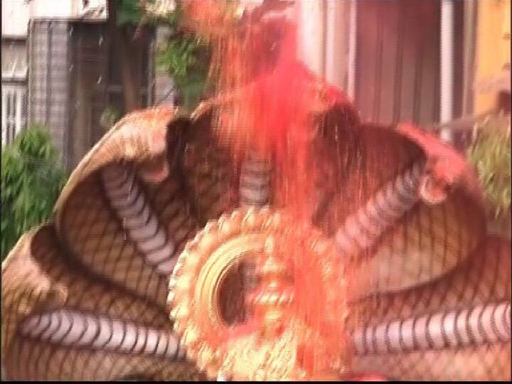 मंडपातून बाहेर आल्यानंतर मुंबईच्या राजावर पुष्पवृष्टी करण्यात आली