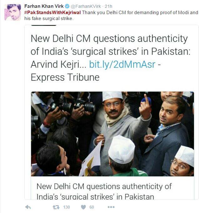 नवी दिल्ली: पीओकेमध्ये सर्जिकल स्ट्राईकवरुन तणावाचे वातावरण असताना पंतप्रधानांडून सर्जिकल स्ट्राईकचे पुरावे मागणाऱ्या दिल्लीचे मुख्यमंत्री अरविंद केजरीवालांचा पाकिस्तानी ट्रॉलरमध्ये उदो उदो होतोय.