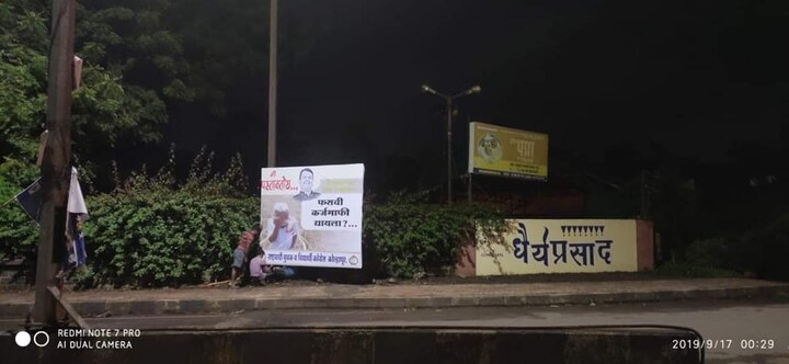 होर्डिंग्जवर कर्जमाफी, कडकनाथ, महापूर, कांदा आयात, गड-किल्ले यांचा उल्लेख करण्यात आला आहे.