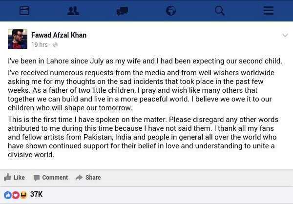 दहशतवादी हल्ल्यासंदर्भात फवाद खानची पहिली प्रतिक्रिया