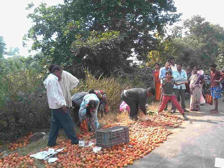 अपघातानंतर तिथे गोळा झालेल्या लोकांनी ट्रकमधून रस्त्यावर पडलेले टोमॅटो जमवून घरी नेण्यासाठी एकच गर्दी केली.
