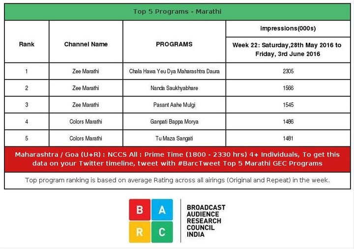 'बार्क इंडिया'ने 22 व्या आठवड्यातील (28 मे 2016 ते 3 जून 2016) मराठीतील टॉप-5 मालिका जाहीर केल्या आहेत. महाराष्ट्र आणि गोवा या दोन राज्यांमधील प्रेक्षकांच्या सर्वेक्षणावरुन ही आकडेवारी जाहीर केली जाते. पाहूया मराठीतील टॉप-5 मालिका कोणत्या आहेत?