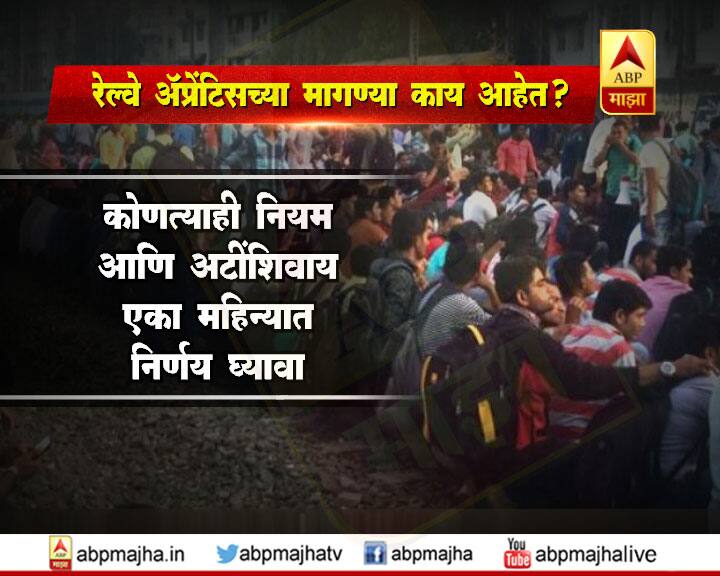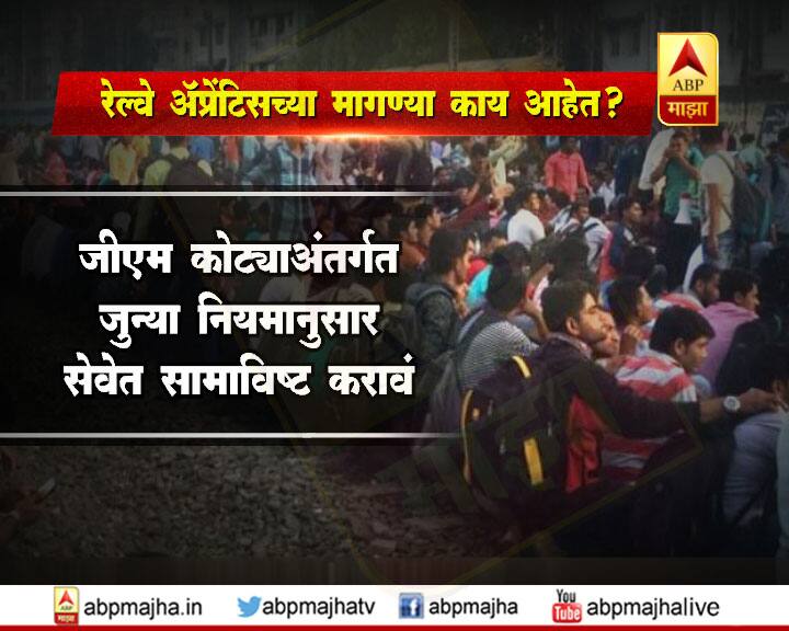 अप्रेटिंस विद्यार्थ्यांसाठी 20 टक्के कोटा दिला आहे तो रद्द करा, रेल्वे जीएम कोट्यातून भरती होत होती तशी सुरु करा, रेल्वेत अडीच लाख जागा रिक्त असताना जागा भरल्या जात नाहीत त्या भरल्या जाव्यात, अशा प्रमुख मागण्या या प्रशिक्षणार्थींच्या आहेत.
