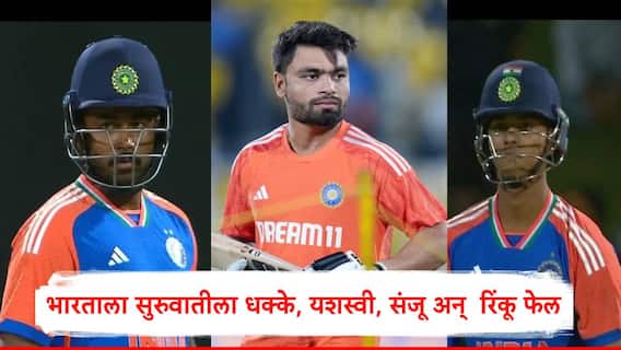 भारताच्या डावाची सुरुवात निराशाजनक झाली असून यशस्वी जयस्वाल, संजू सॅमसन (Sanju Samson) आणि रिंकू सिंग, सूर्यकुमार यादव लवकर बाद झाले आहेत. यशस्वी जयस्वाल मागील मॅचप्रमाणं यावेळी देखील बाद झाला. तर, संजू सॅमसन आणि रिंकू सिंगला चांगली कामगिरी करता आली नाही. संजू सॅमसन पुन्हा फेल ठरला, तो खातंही उघडू शकला नाही तर रिंकू सिंगनं केवळ 1 रन केली
