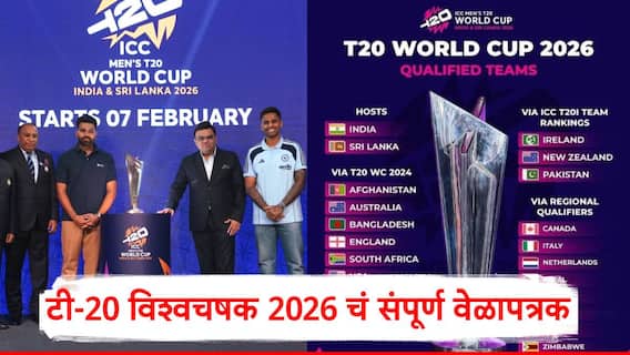 T20 World Cup 2026 Full Schedule: आयसीसीने 2026 च्या टी-20 विश्वचषकाचे (T20 World Cup 2026) अधिकृत वेळापत्रक (T20 World Cup 2026 Full Schedule) जाहीर केले आहे. 7 फेब्रुवारी 2025 पासून टी-20 विश्वचषक 2026 चा थरार रंगणार असून 8 मार्च 2026 पर्यंत ही स्पर्धा खेळवण्यात येईल. भारत आणि श्रीलंका यंदाच्या टी-20 विश्वचषकाचे आयोजन करणार आहे. टी-20 विश्वचषक 2026 च्या स्पर्धेत (T20 World Cup 2026) 30 दिवसांत 55 सामने खेळवण्यात येणार असून 20 संघ निश्चित करण्यात आले आहे.
