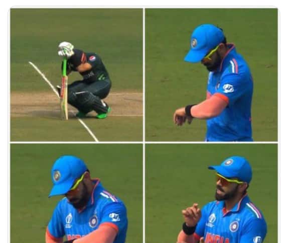 Virat Kohli vs Mohammad Rizwan : भारताने नाणेफेक जिंकून प्रथम गोलंदाजी करण्याचा निर्णय घेतल्यानंतर पाकिस्तानने प्रथम फलंदाजी करताना शानदार सुरुवात केली आहे. अहमदाबादच्या नरेंद्र मोदी स्टेडिअमवर एक लाख चाहत्यांसमोर विराट कोहलीने पाकिस्तानच्या मोहम्मद रिजवानला ट्रोल केले. झालं असे की, 73 धावसंख्येवर पाकिस्तानला दुसरा धक्का बसला. इमाम उल हक बाद होऊन तंबूत परतला. त्यामुळे मोहम्मद रिझवान फलंदाजीसाठी मैदानात आला. पण रिझवान याने खेळपट्टीवर फलंदाजीसाठी तयार होण्यासाठी जास्त वेळ घेतला. कडाक्याच्या ऊन्हात फिल्डिंग करणाऱ्या विराट कोहलीला ही बाब खटकली. त्यामुळे विराट कोहलीने लाखभर लोकांसमोर रिझवान थेट घड्याळच दाखवलं.