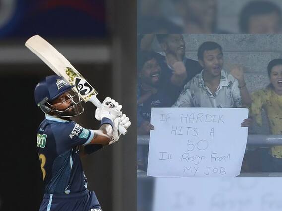 SRH vs GT : आयपीएलच्या 21 (IPL 2022) व्या सामन्यात सनरायजर्स हैदराबादने गुजरात टायटन्सला (SRH vs GT) आठ विकेट्सनी मात दिली. पण सामन्यात दोन्ही कर्णधारांनी झळकावलेल्या संयमी अर्धशतकामुळे क्रिकेट रसिकांचे चांगले मनोरंजन झाले. दरम्यान हार्दिकच्या (Hardik Pandya) अर्धशतकानंतर एक नवा किस्सा व्हायरल होत आहे. झालं असं की, मैदानात आलेल्या एका प्रेक्षकाने 'हार्दिकने आज अर्धशतक झळकावल्यास मी नोकरी सोडेन' असा पोस्टर तयार करुन हातात पकडला होता. कॅमेरामनने देखील हा पोस्टर टीपला असून आता हार्दिकने अर्धशतक झळकावल्यानंतर या प्रेक्षकाने खरचं नोकरी सोडली का?, आता याचं काय होणार? असे एक न अनेक प्रश्न नेटकऱ्यांना पडले असून विविध मीम्स देखील व्हायरल होत आहेत.
