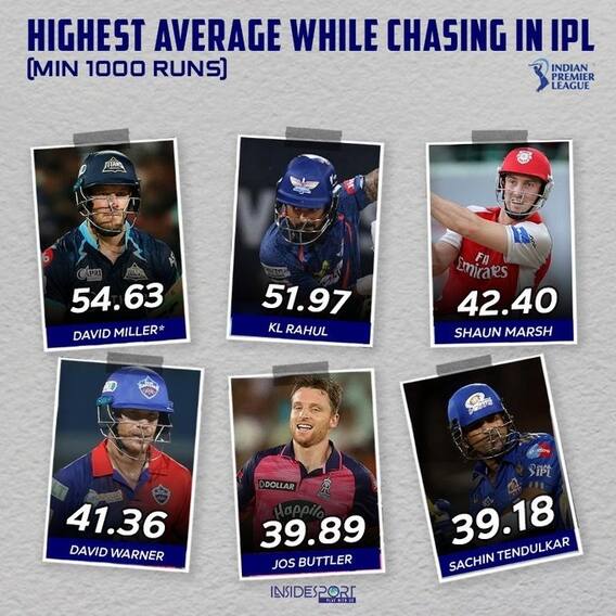 धावांचा पाठलाग करताना आयपीएलमध्ये सर्वात यशस्वी डेविड मिलर आहे. डेविड मिलर याने धावांचा पाठलाग करताना 54.63 च्या सरासरीने धावा केल्या आहेत. डेविड मिलर आयपीएलमधील चेज मास्टर आहे. डेविड मिलरनंतर या यादीत भारताचा केएल राहुल याचा क्रमांक लागतो. धावांचा पाठलाग करताना केएल राहुल जवळपास ५२ च्या सरासरीने धावा काढतो. आघाडीच्या पाच खेळाडूमध्ये राहुल एकमेव भारतीय खेळाडू आहे. या यादीत तिसऱ्या क्रमांकावर शॉन मार्श आहे. लक्षाचा पाठलाग करताना शॉन मार्श जवळपास ४३ च्या सरासरीने धावा काढत होता. त्यानंत यादीत आणखी एका ऑस्ट्रेलियाच्या फलंदाजाचे नाव आहे. डेविड वॉर्नर... लक्षाचा पाठलाग करताना जवळपास ४२ च्या सरासरीने धावा काढतो..त्यानंतर जोस बटलर याचा क्रमांक लागतो. जोस बटलर सध्या तुफान फॉर्मात आहे. प्रथम फलंदाजी करताना ज्याप्रमाणे बटलर खेळतो, त्याच प्रमाणे दुसऱ्या डावातही बटलर धावांचा पाऊस पाडतो. बटलर जवळपास ४० च्या सरासरीने धावा काढतो. भारताचा महान क्रिकेटपटू सचिन तेंडूलकर धावांचा पाठलाग करताना ३९.२८ च्या सरासरीने धावा काढतो. तो या यादीत सहाव्या क्रमांकावर आहे.
