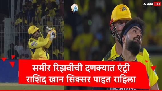 चेन्नईच्या टीमनं समीर रिझवीला 8.4 कोटी रुपये मोजून संघात सामील करुन घेतलं होतं.गुजरात टायटन्सच्या बॉलर राशिद खाननं 19 व्या ओव्हरमध्ये शिवम दुबेला 51 धांवावर बाद केलं होतं. त्यानंतर समीर रिझवी फलंदाजीसाठी मैदानावर उतरला होता. राशिद खान सध्या आंतरराष्ट्रीय क्रिकेटमधील नावाजलेला स्पिनर बॉलर आहे. राशिद खानचा सामना करणाऱ्या समीर रिझवीनं पहिल्याच बॉलवर सिक्स मारला.