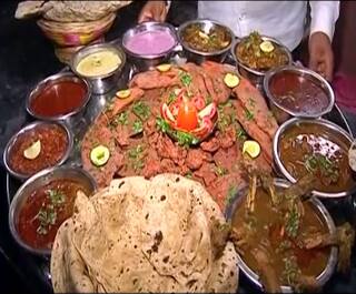 हिंद केसरी.. या नावातच जसा रुबाब आहे तसाच तो या थाळीतही.. नाशिकच्या मखमलाबाद जवळील हिंद केसरी हे हॉटेल सध्या सर्वत्रच चर्चेचा विषय ठरतय आणि त्याला कारण ठरतय ति ही थाळी जिची किंमत आहे 5 हजार रुपये.. या थाळीत उकड सुप, 8 पॉपलेट, 8 सुरमई, 25 प्रॉनझ फ्राय, 20 प्रॉनझ ग्रेव्ही, 8 चिकन लेग पिस, चिकन करी, सुके चिकन, सुके मटण, खिमा, 8 ज्वारीच्या भाकरी, 8 बाजरीच्या भाकरी, 8 तांदळाच्या भाकरी, 16 चपाती, 24 सागोती वडे, सोलकढी, झिंगा चटणी, कोळबी रस्सा, खेकड़ा रस्सा आणि भात यांचा समावेश आहे. ही थाळी उचलायला 2 माणसेही कमी पडतात..