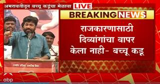 बच्चू कडू यांचं भाषण डोयलॉगने सुरू. जली को आख कहते हे बुजी को राख कहते हे. ओर जीस भारुद से राख निखलती हे उसे प्रहार कहते हे. पहिली चूक आहे म्हणून माफ केलं पण यानंतर जर कोणी वार केला तर प्रहार केल्या शिवाय राहणार नाही. बच्चू कडूंच मोठं विधान