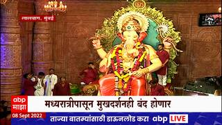 Lalbaugcha Raja : लालबागच्या राजाच्या चरणस्पर्शार्ची रांग सकाळी सहा वाजल्यापासून बंद करण्यात आली आहे.. तर मुखदर्शन मध्यरात्री बारा वाजल्यापासून बंद करण्यात येणार आहे. उद्याच्या विसर्जनाची तयारी करण्यासाठी हा निर्णय घेण्यात आलाय..
