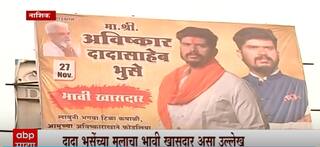 दादा भुसेंचे पुत्र अविष्कार भुसेंचे पोस्टर्स, चर्चेला उधाण. सत्ताधारी नेत्यांमध्ये रंगलंय कुरघोडीचं राजकारण. दादा भुसेंच्या मुलाचा भावी खासदार असा उल्लेख.